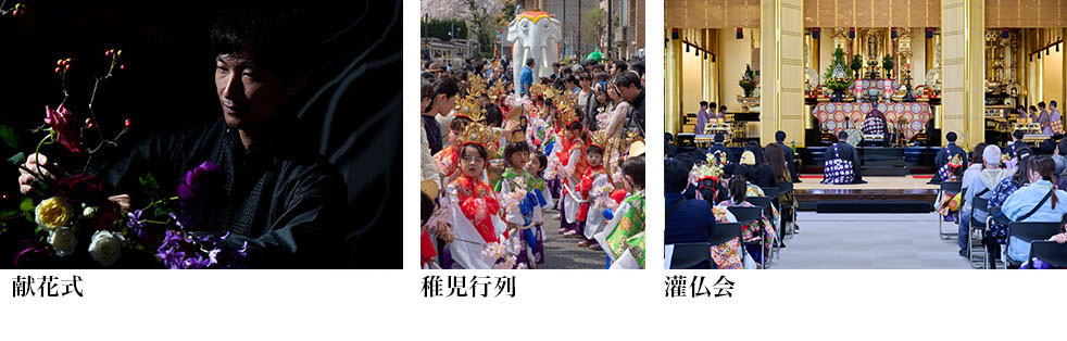 今年のはなまつりでは、恒例の稚児行列や境内でのステージショーに加えて、「未生流笹岡による花展」も開催します。